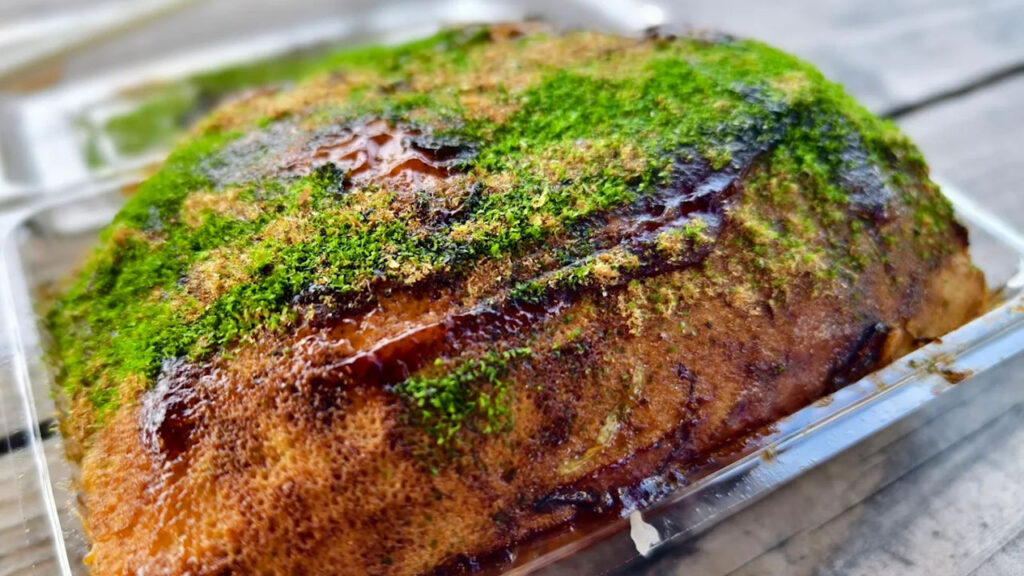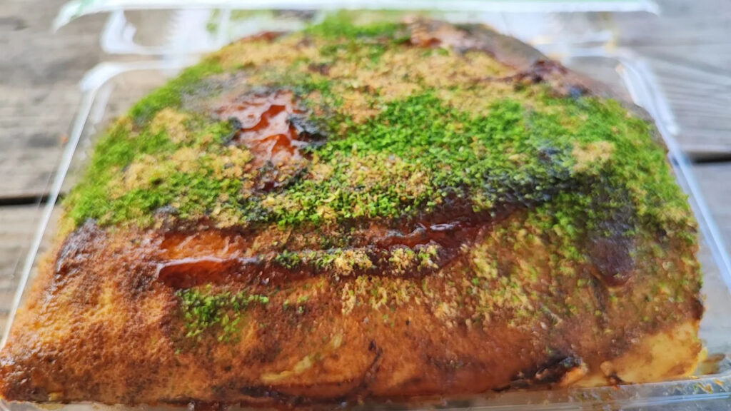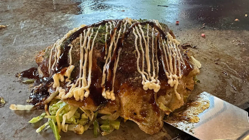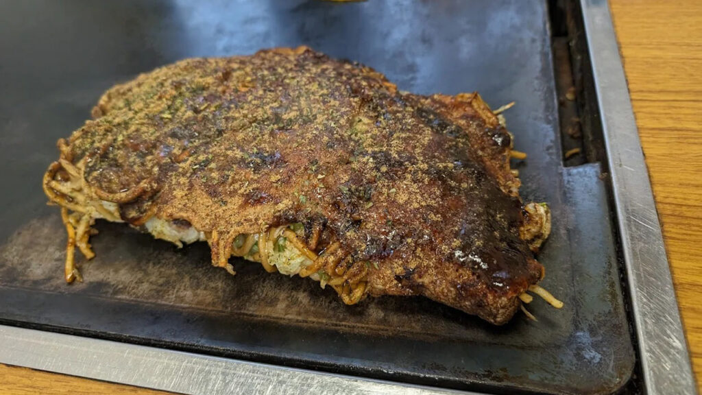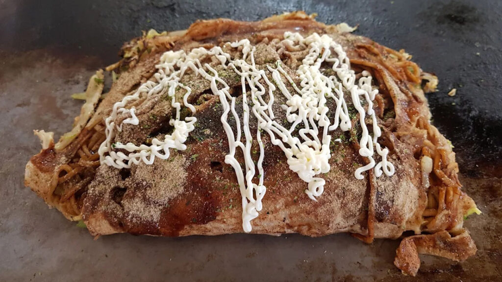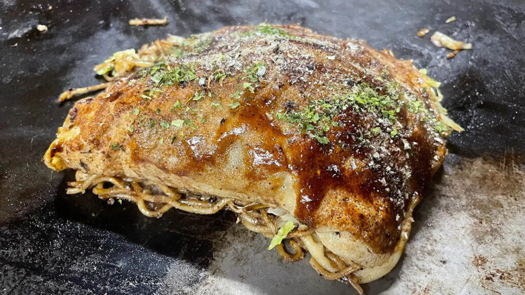 - 焼き上がりの三津浜焼きは、外は香ばしく中はもちもちで、一枚でも大満足