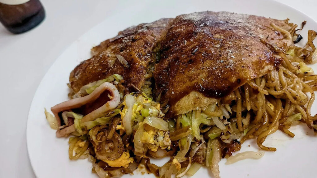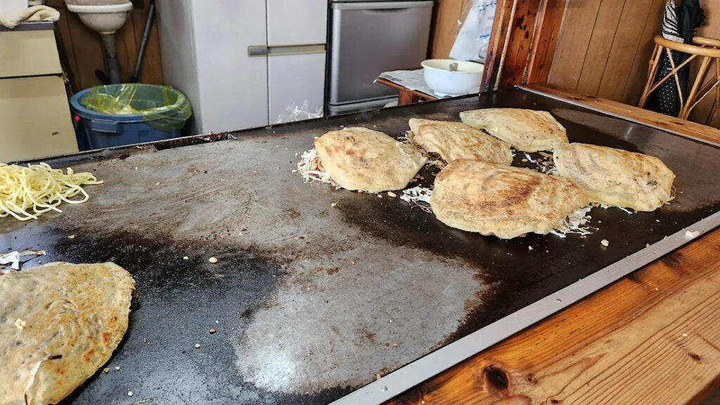 「那須」は、地元の人々に愛され続けている老舗の三津浜焼き店です。創業から長年変わらない味を守っており、親しみやすい女将の接客がアットホームな雰囲気を醸し出しています。那須の三津浜焼きは、生地を極薄に焼きあげ、そこに蒸し中華麺(そば)を載せて重ねる伝統スタイルが特徴です。麺は湯がいた蒸し麺を使っており、コシがあってもちもちとした食感が魅力。創業50年以上という歴史を感じさせる、地元に根づいた名店です。