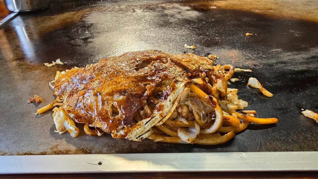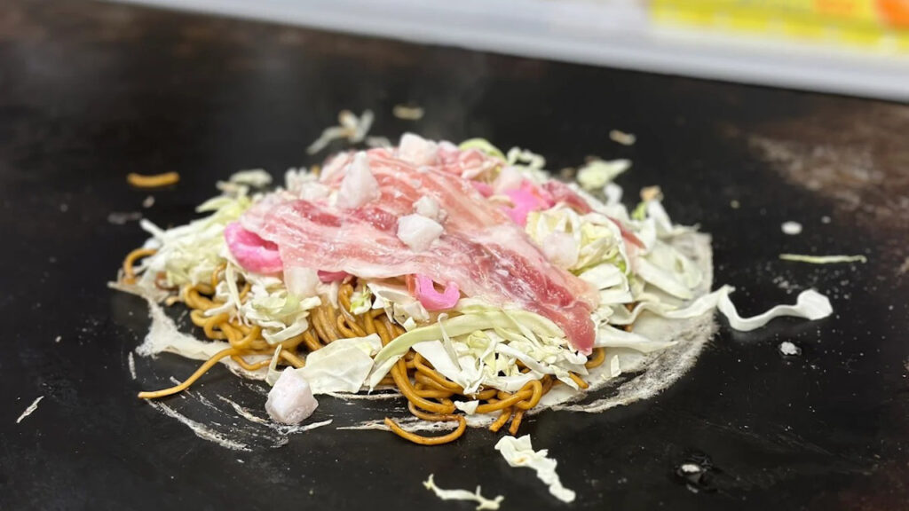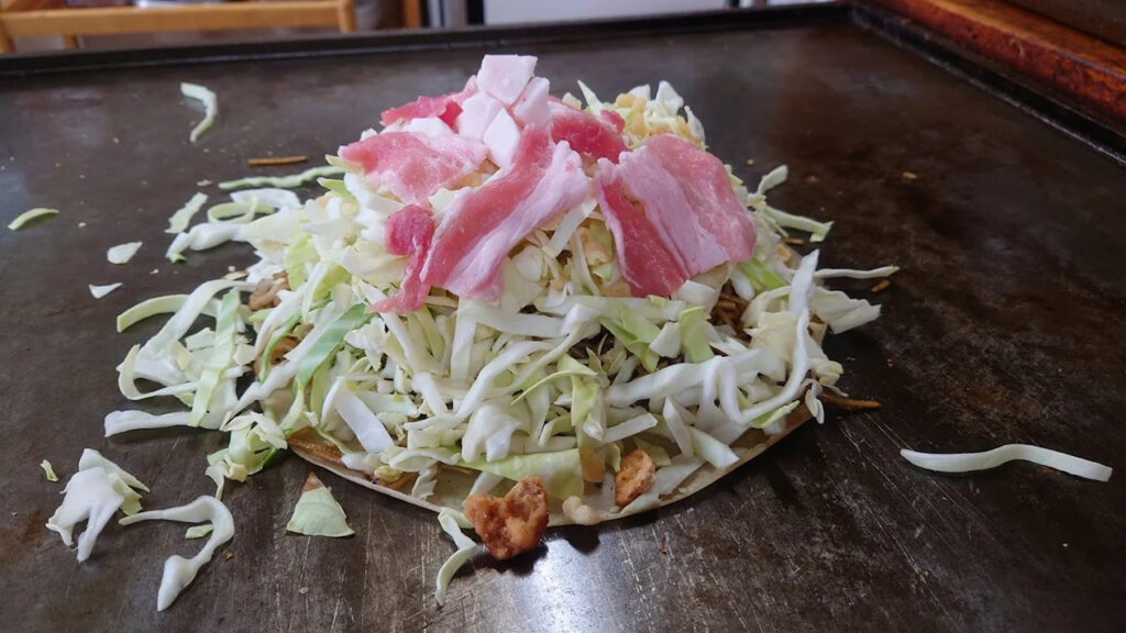 特徴は、薄く伸ばした生地の上に、味付けされたそばやうどんをはじめ、キャベツやちくわ・牛脂・天かすなどを順にのせ、半月形に折りたたむ点にあります。広島風お好み焼きと似ている部分もありますが、広島風が具材を生地の上に直接重ねるのに対し、三津浜焼きでは生地を先に焼き、その上に麺を置く調理法が独自です。