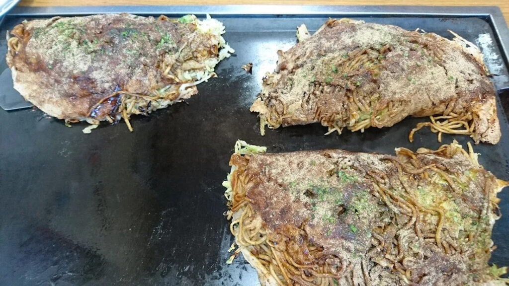 - 麺をソースで味付けしてから生地に乗せる「台付」スタイルは、三津浜焼きならではの美味しさ