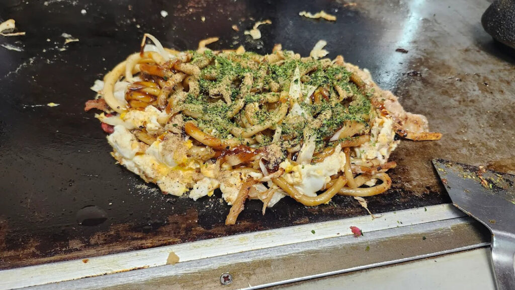 「お好み焼き みよし」では、伝統的な「台付(麺入り)」の三津浜焼きを提供。うどんかそば、シングルかダブル(1.5玉も可能)の麺量を選べるシンプルなメニュー構成が特徴で、価格も手ごろです。昔ながらの雰囲気を残す小さな鉄板前カウンター席が特徴で、出来たての三津浜焼きをすぐに味わえる温かいお店です。ソースでしっかり味付けされた麺・生地のふんわり感・そして牛脂のコク。また、魚粉を使っており、風味豊かで濃厚な味わいが楽しめます。
