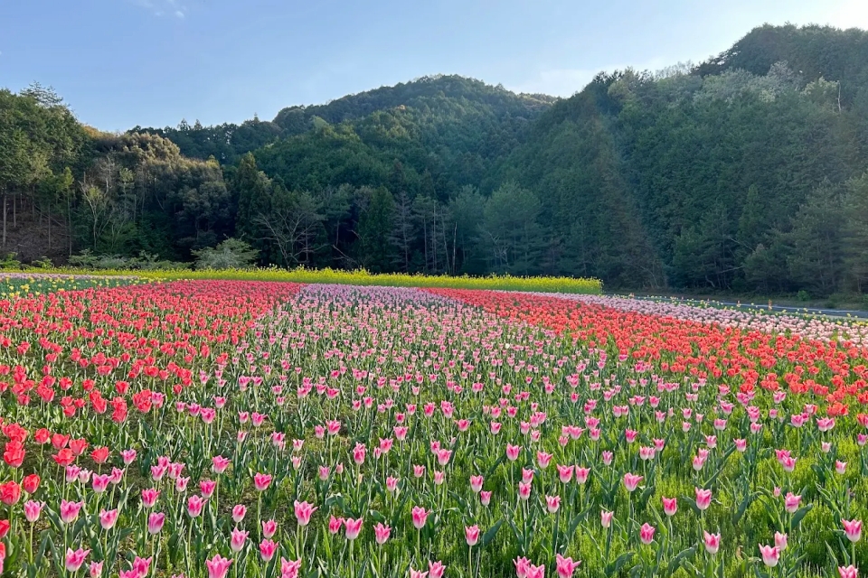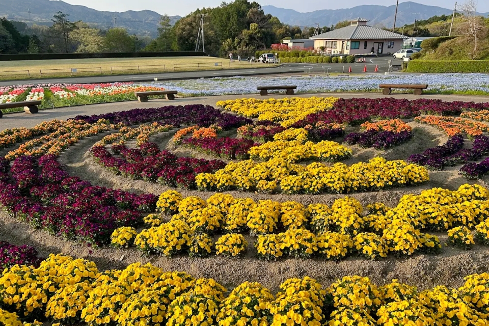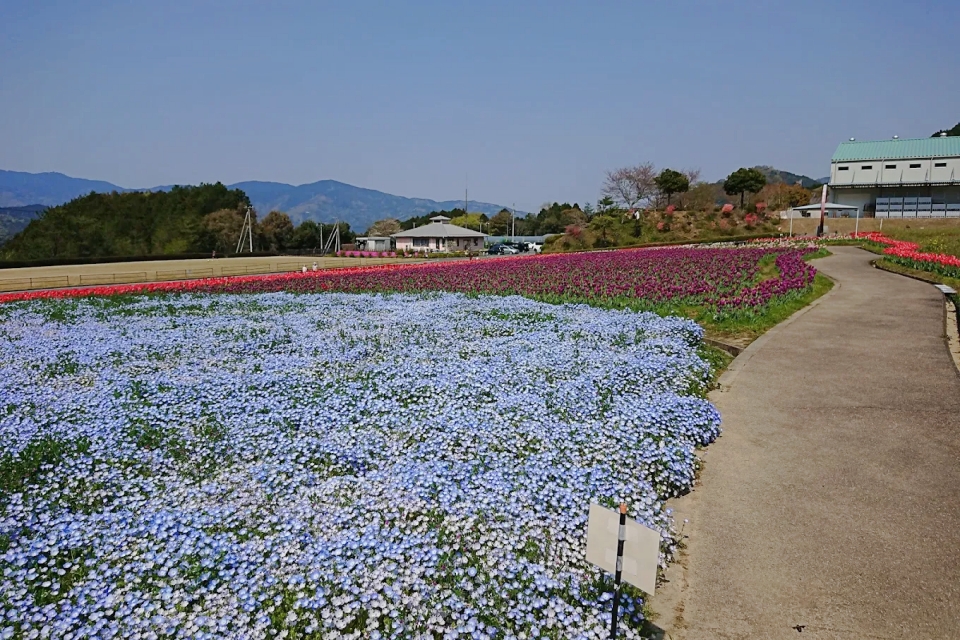 フラワーパークおおず 体験学習館チューリップやネモフィラなど四季折々の花が咲き誇る公園無料駐車場・トイレ完備、歩きやすい平坦な園内