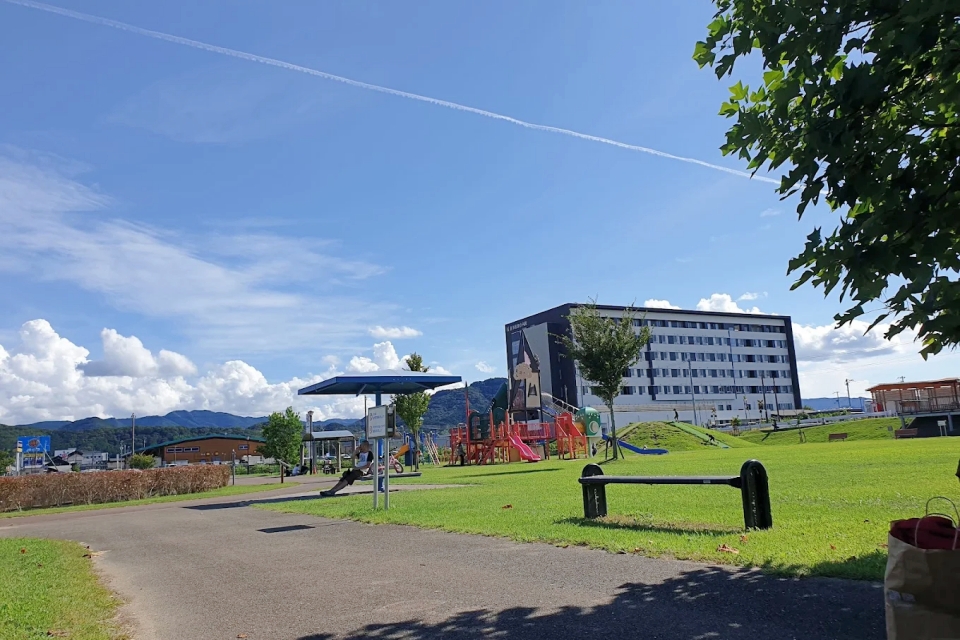 | 設備・サービス | 遊具: 子供用遊具、健康ストレッチ器具、バスケットゴール(2基) 多目的スペース: 人工芝広場、舗装路(スケボー・自転車練習可)、遊歩道(1周約400m) トイレ: あり(水洗・清潔) その他: 防災用遊水地機能、近隣を列車(アンパンマン列車等)が通過 |
