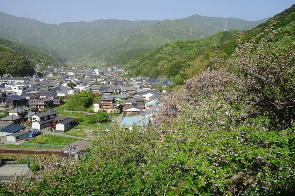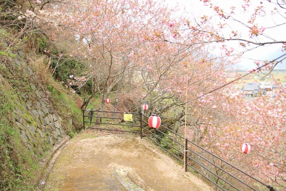 大洲市八多喜町にある「祇園公園」は、四国でも珍しいほど見事な八重桜が咲き誇る絶景スポットです。ソメイヨシノが散った後の4月中旬頃に満開を迎え、鮮やかなピンク色の花が山全体を彩ります。麓には子供向け遊具もあり、そこから約200メートルの勾配がある遊歩道を登ると、眼下には八多喜の美しい街並みが広がります。道中には数多くの句碑が並び、スピーカーから流れる懐かしの昭和歌謡を聴きながら散策を楽しめるのもこの公園ならでは。頂上のベンチでお花見を楽しみながら、ゆったりとした時間を過ごせる地元の人々に愛される憩いの場です。