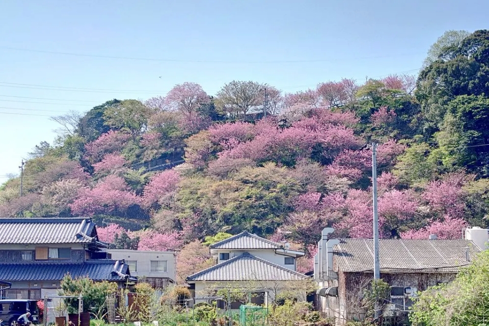 - ソメイヨシノよりもピンクが濃く重厚感のある八重桜が山全体を埋め尽くす圧巻の景色