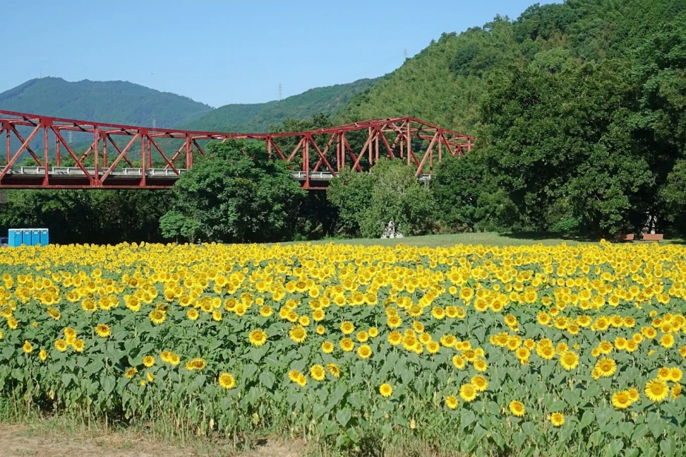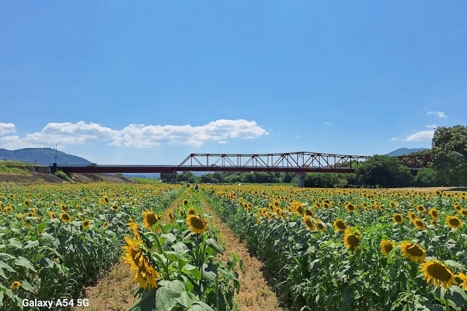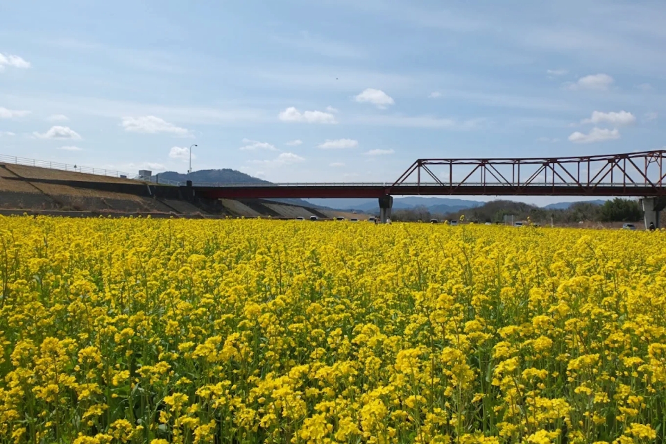 | 畑の前河川敷広場 | 菜の花・ヒマワリ・コスモスと赤橋のコントラスト | 無料 | 駐車場あり、河川敷広場、ペット同伴可 |