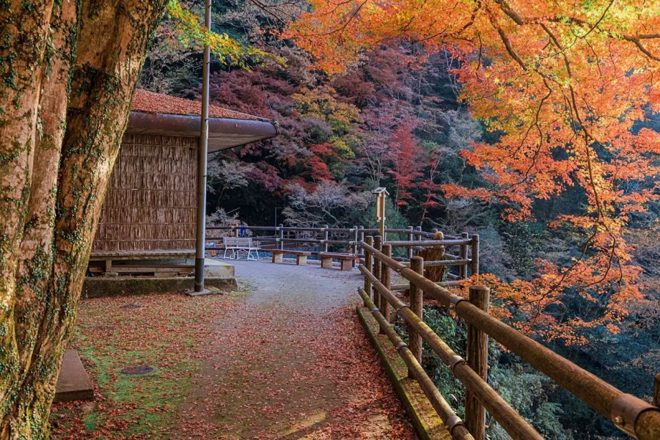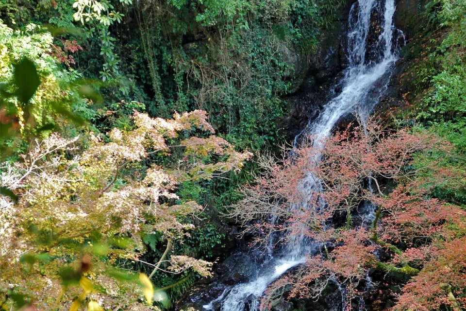 - 秋の鮮やかな紅葉と複数の滝が織りなす圧倒的な自然美